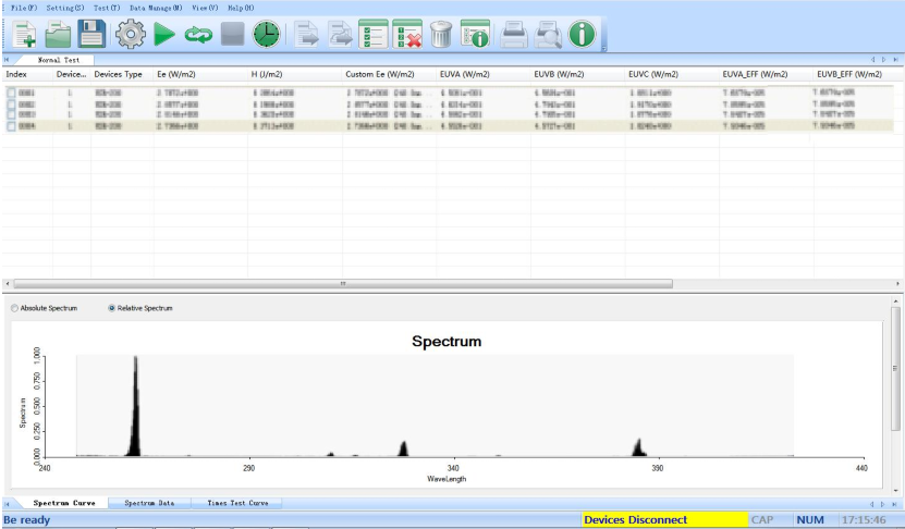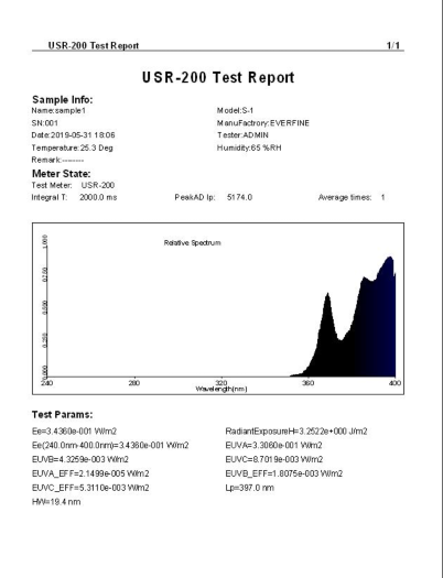 1) El método espectral se usa para medir la distribución de potencia espectral relativa, la longitud de onda máxima, el ancho de banda de la mitad del pico, el valor de irradiancia espectral de la banda UVB, la banda UV310 y la banda UVC (UV254nm) de la fuente de luz UV, y la irradiancia total en cualquier banda específica dentro de 240-400nm.
