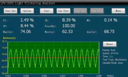 LFA-2000 tiene dos modos de funcionamiento: modo de prueba continua para iluminadores estables y modo de prueba simple para iluminadores instantáneos. Este instrumento puede usarse para probar el flujo luminoso (o iluminancia), y luego mostrar la forma de onda y los resultados analizados.